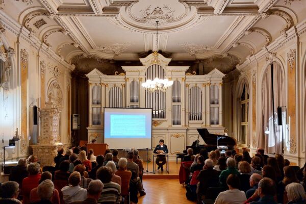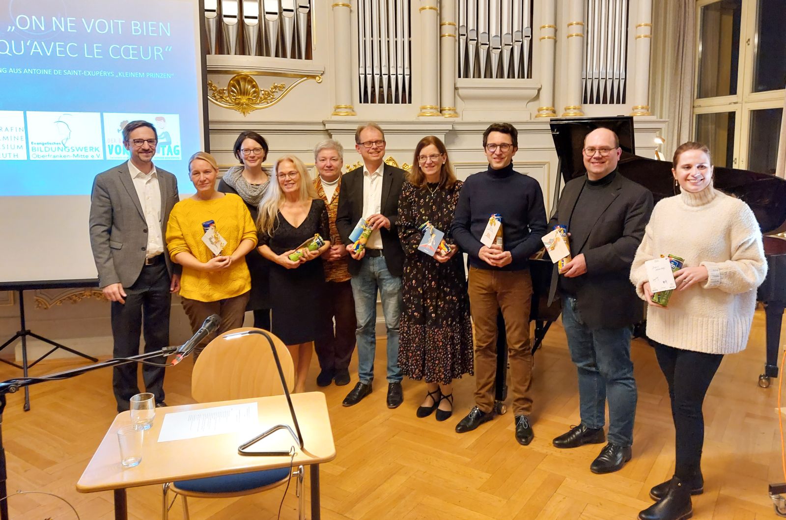 „Ein zauberhafter Abend!“, „Wunderschön!“ und ähnliche begeisterte Kommentare hörte man am 17. November 2023, als die letzten Töne des Boléro de concert von Louis James Alfred Lefébure-Wély verklungen waren, gespielt von Michael Dorn an der Orgel der Aula im Markgräfin-Wilhelmine-Gymnasium. Er rundete musikalisch eine Veranstaltung ab, die sich dem „Kleinen Prinzen“ von Antoine de Saint-Exupéry gewidmet hatte. Im Rahmen des Bundesweiten Vorlesetags hatten Elisabeth Götz, Sophie Woelk, Julien Kurtz und Dr. Jürgen Raithel verschiedene Passagen aus dem Werk vorgetragen. Der Kleine Prinz begegnet einem König, der darauf bedacht ist, jeweils nur das zu befehlen, was auch geleistet werden kann; er trifft auf einen Laternenanzünder, der scheinbar sinnlose Vorschriften befolgte, dessen Tätigkeit aber ästhetischen Wert hat, und er kommt einem Fuchs näher, der ihm das Wesen der Freundschaft und Liebe erläutert. In das Leben und Werk des Autors führte Dr. Katharina Städtler ein; die Vorlesepassagen wurden inhaltlich verbunden und in Beziehung zueinander gesetzt von Dr. Angela Hager vom Evangelischen Bildungswerk. Dr. Steffen Arzberger, der die Veranstaltung organisiert hatte, dankte den genannten sowie Uta Schütze und Julien Kurtz für ihre musikalischen Beiträge am Flügel – Beethoven, Chopin und Medtner – sowie Katrin Buchzik-Weber für die stimmungsvolle Gestaltung des Saales mit Projektionen des Kleinen Prinzen. Beschwingt begaben sich die Zuhörer nach eineinviertel Stunden literarisch-musischen Genusses zum Buffet des Schulcafés blu, das unter der Leitung von Sarah Rutzenhöfer mit Fingerfood und einer Auswahl verschiedener Getränke schließlich auch für leiblichen Genuss sorgte.