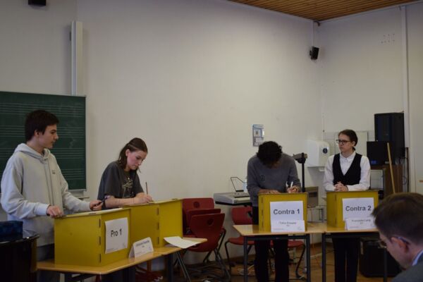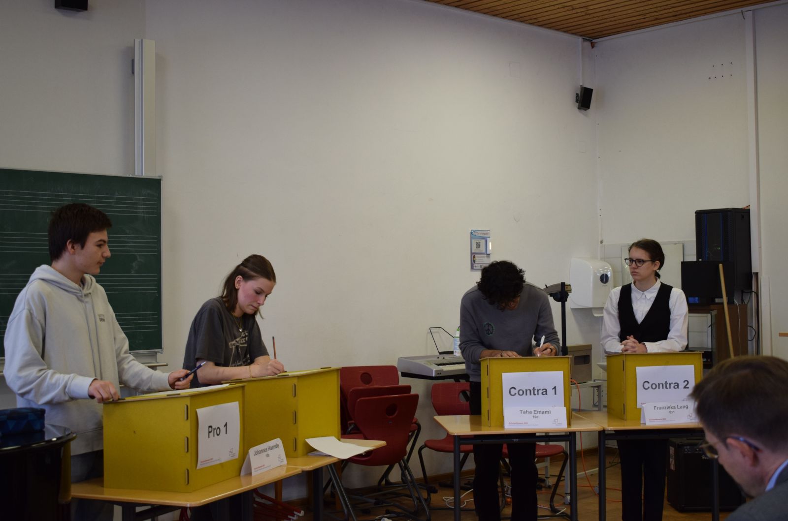 Im Folgenden erklärten Louis Bruchmann und Julius Haendle, die durch die Veranstaltung führten, den Ablauf einer Debatte und stellten die Finalisten mitsamt dem Thema vor. Diese stiegen direkt in ihr Duell ein und boten dem Publikum eine professionelle und kompetente Debatte, die zum Nachdenken und zur Auseinandersetzung mit der Streitfrage anregte. Die Schwierigkeit beim Küren eines Siegers äußerte sich nicht nur durch den kompetitiven Charakter der Debatte, sondern auch durch die außergewöhnlich lang andauernde Beratungszeit, die die Jury benötigte, um die Platzierungen auszumachen. Schlussendlich erreichte Justus Gallert den ersten, Franziska Lang den zweiten, Laura Finke den dritten und Johannes Haendle den vierten Platz. Somit werden Justus und Franziska das MWG beim Regionalentscheid am 15. Februar in Münnerstadt repräsentieren.