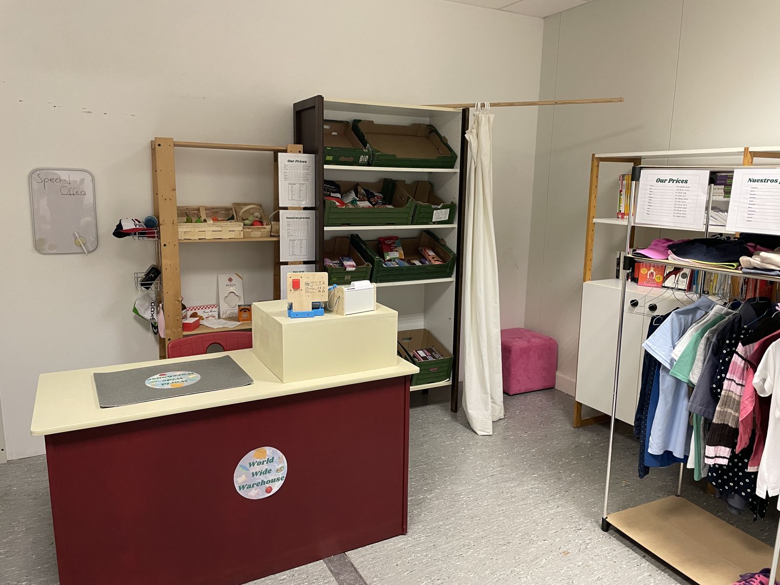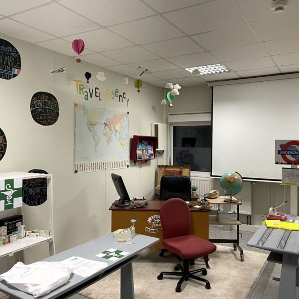 In diesem Zimmer im Pavillon kann ab jetzt auf Französisch, Spanisch und Englisch eingekauft, eine Reise gebucht, im Hotel eingecheckt, eine Fernsehshow erstellt und eine Sightseeingtour gemacht werden. Alle Requisiten und Kulissen stehen bereit und warten auf euch!