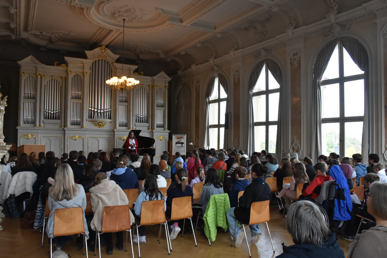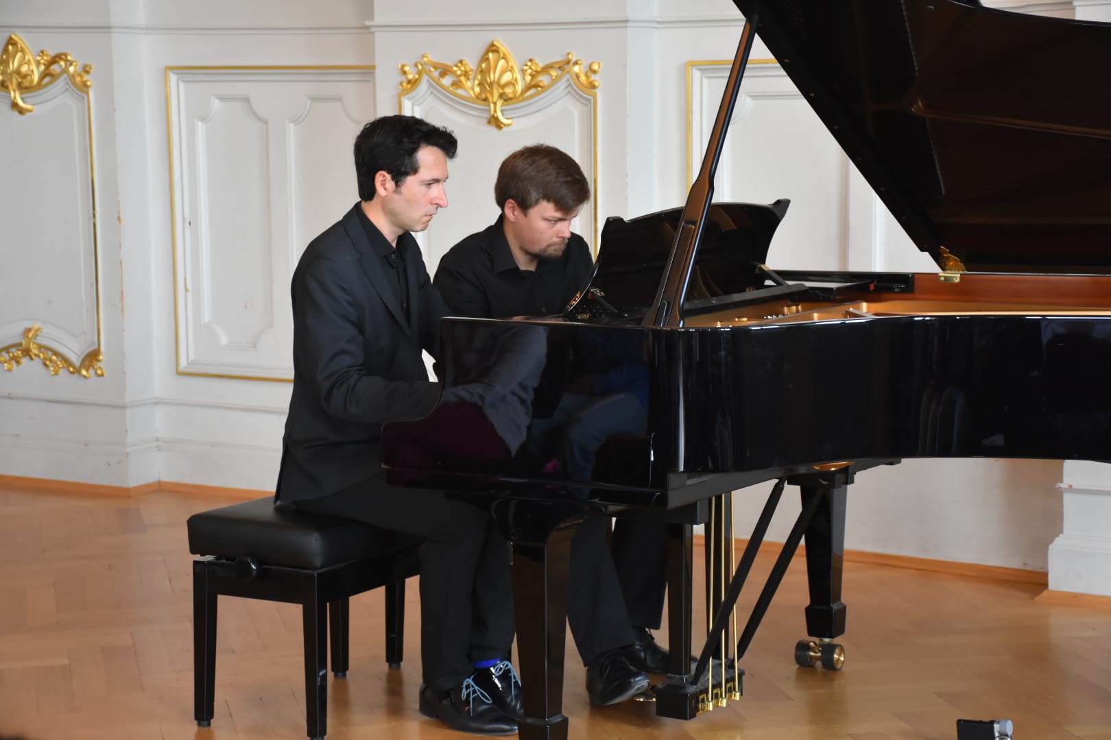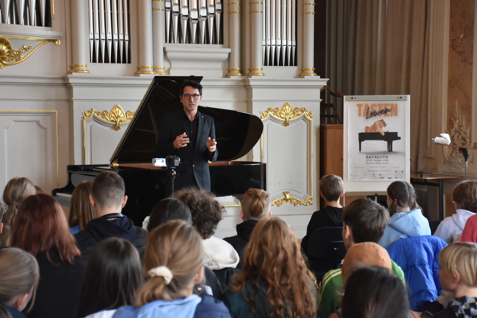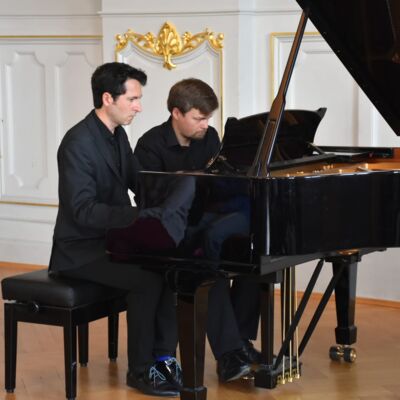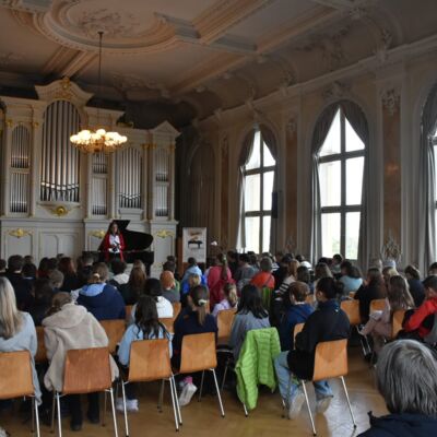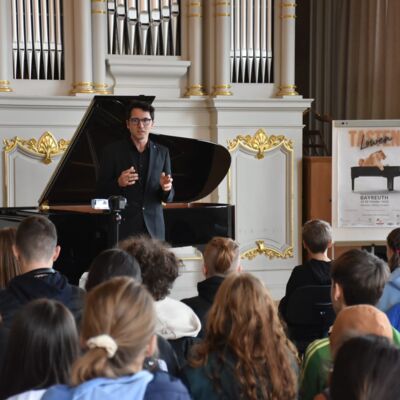 Eine Höhle der Löwen war unsere Aula am 18.10.2023, genauer: der Tastenlöwen. Als solche bezeichnen sich die Teilnehmer des internationalen Klavierfestivals „Les amateurs virtuoses“, das vom 19. bis zum 22.10.2023 in Bayreuth stattfand. Bevor es am Donnerstag in der Villa Wahnfried öffentlich losging, bekamen unsere Klavierschülerinnen und -schüler und ihre Lehrkräfte einen Vorgeschmack im Rahmen eines exklusiven Konzerts am MWG. Frau Götz begrüßte die Anwesenden und insbesondere den Organisator des Festivals, Julien Kurtz aus Pegnitz, sowie Mikhail Dubov aus London. Die beiden spielten sodann vor einem hochinteressierten und stark beeindruckten Publikum Werke von Nikolai Medtner, Peter Tschaikowsky und Nikolai Kapustin sowie die Fantasie in f-Moll von Franz Schubert. Steffen Arzberger, der das Konzert vermittelt hatte, dankte den beiden Pianisten schließlich für ihr Spiel und die zehn Freikarten für das Schlusskonzert im Markgräflichen Opernhaus, die an MWG-Schüler vergeben wurden.